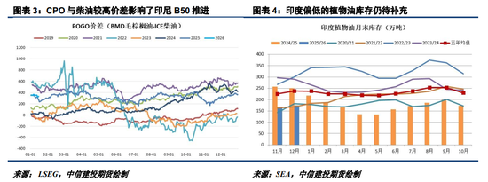 综合来看,在马棕库存大概率见顶、印尼提税预期刺激需求国补库,且美国生柴积极消息增多的背景下,我们预计油脂价格在美豆油支撑下或难再见新低。尽管印尼暂不推进B50及马棕短期出口受印尼抢出口挤占,且美国尚未有明确生柴政策落地,将限制油脂短期价格表现,2026年美国生柴投料需求大幅增长预期仍令油脂中长期价格重心走升可期,关注在美国生柴政策明确前的油脂单边及油粕比的逢低入场机会。